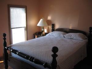 A resident room, with handmade quilt on the bed and comfortable chair at its side