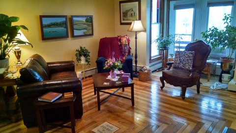 A resident room, with handmade quilt on the bed and comfortable chair at its side